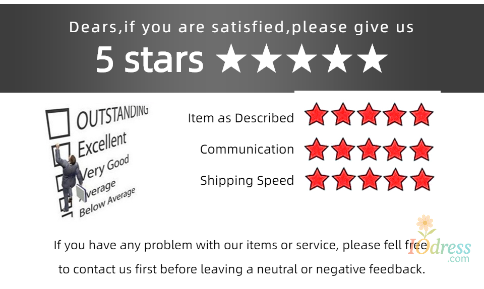 IO Dress is not liable for problems under the following: Wrong size or color picked; Customer‘s subjective factors and just dislikes the item. Return shipping fees and the shipping fees from IO Dress to customer are at customer's own expense.