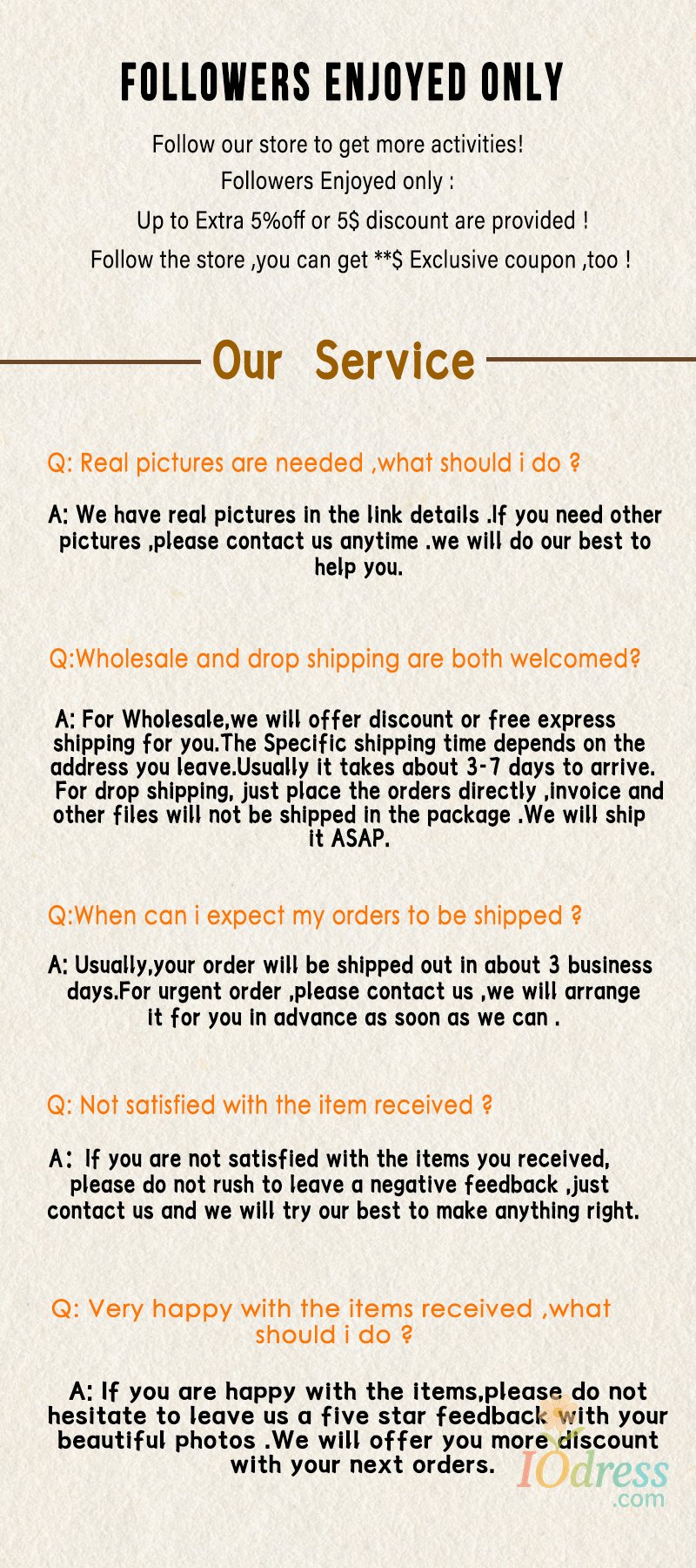 3) PO Box is not accepted if you choose express shipping. Your address should be detailed enough, even include apartment or unit number. Nondelivery or extra shipping fee due to personal reasons will not be taken by Iodress.com.