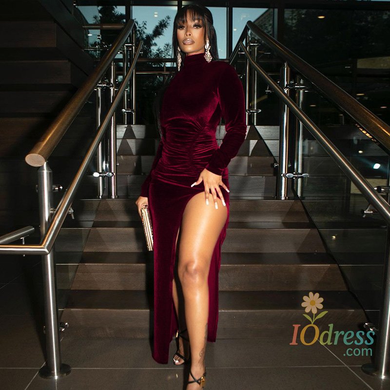 IO Dress Women's autumn and winter style high-necked long-sleeved velvet dress slim pleated slit dress